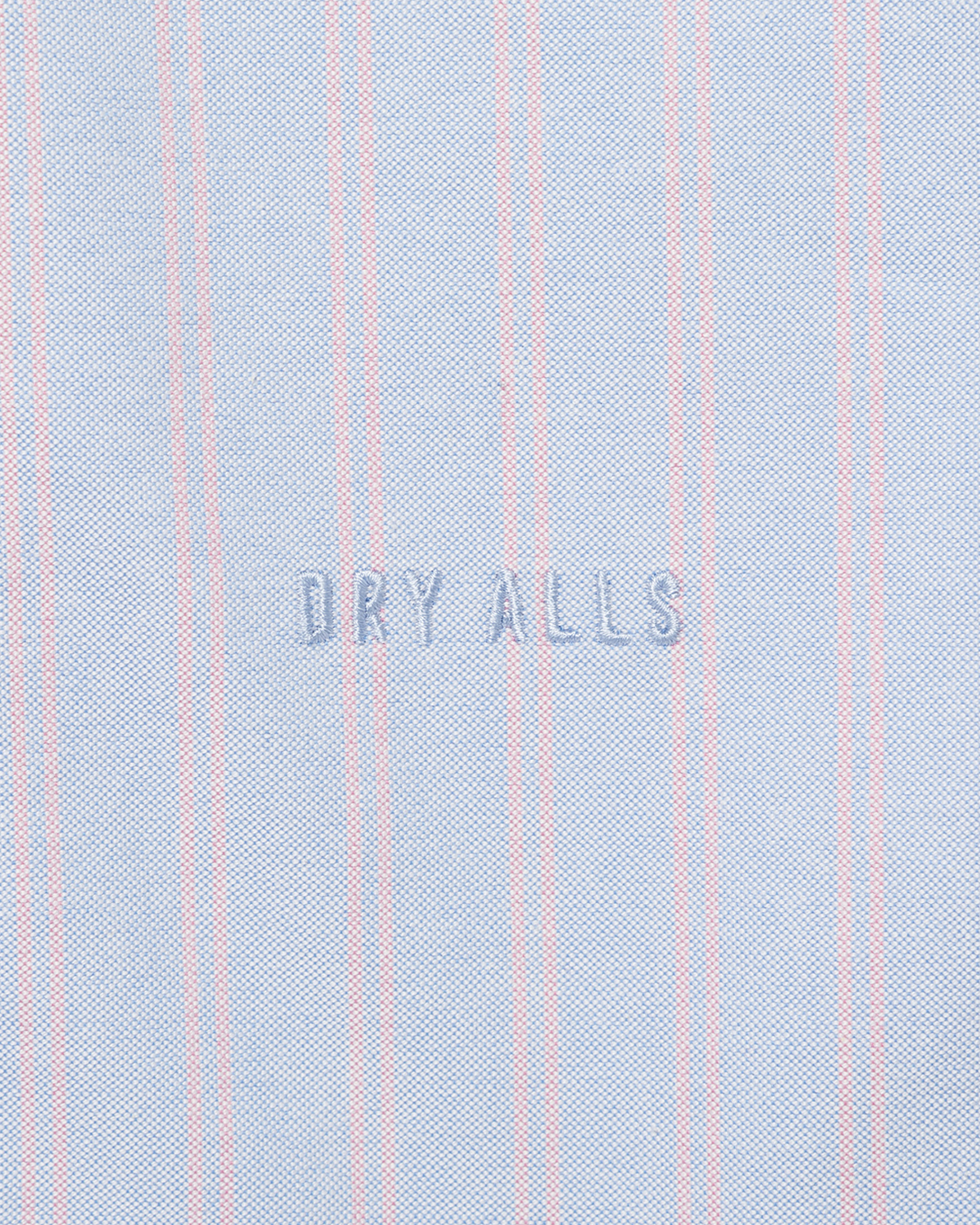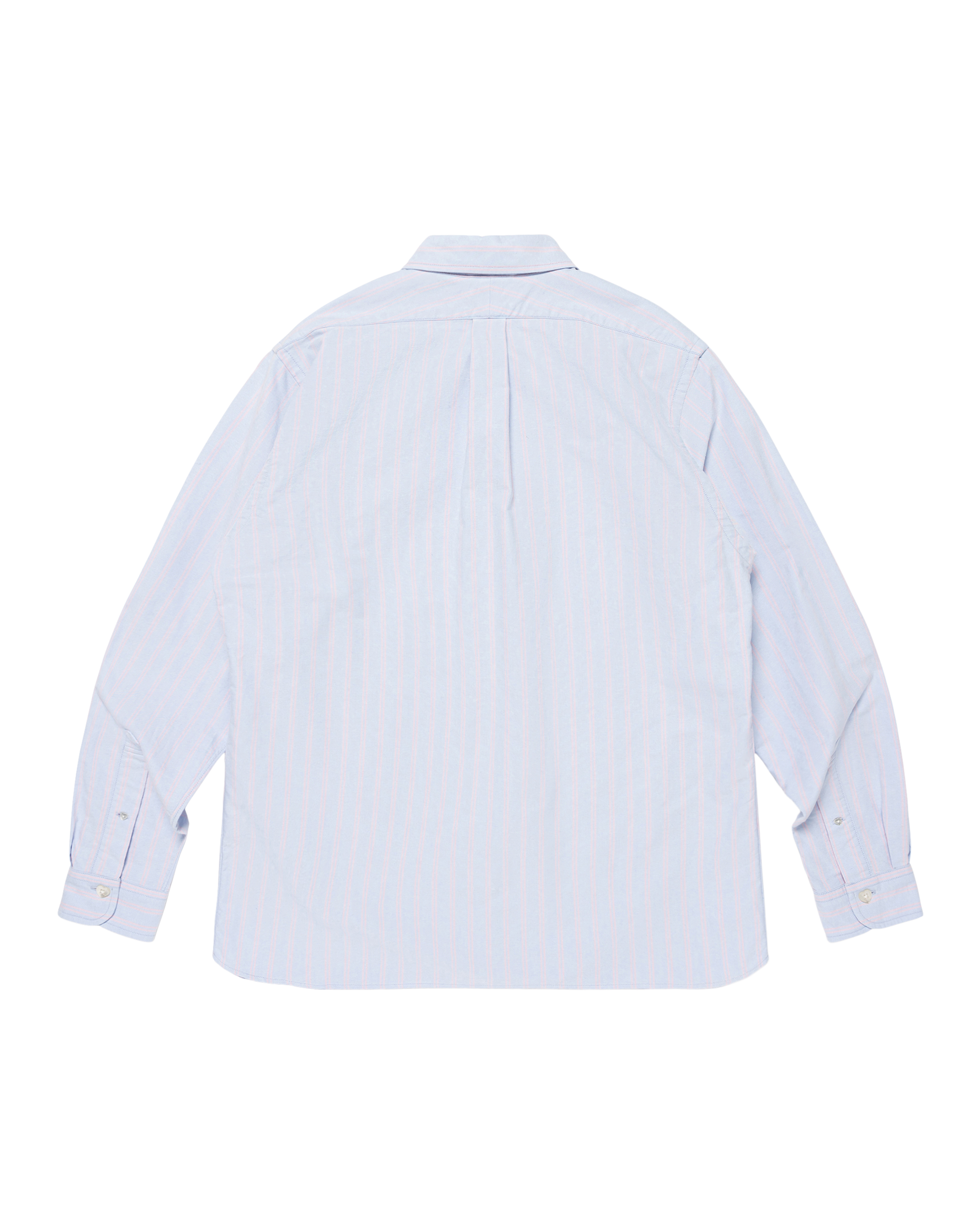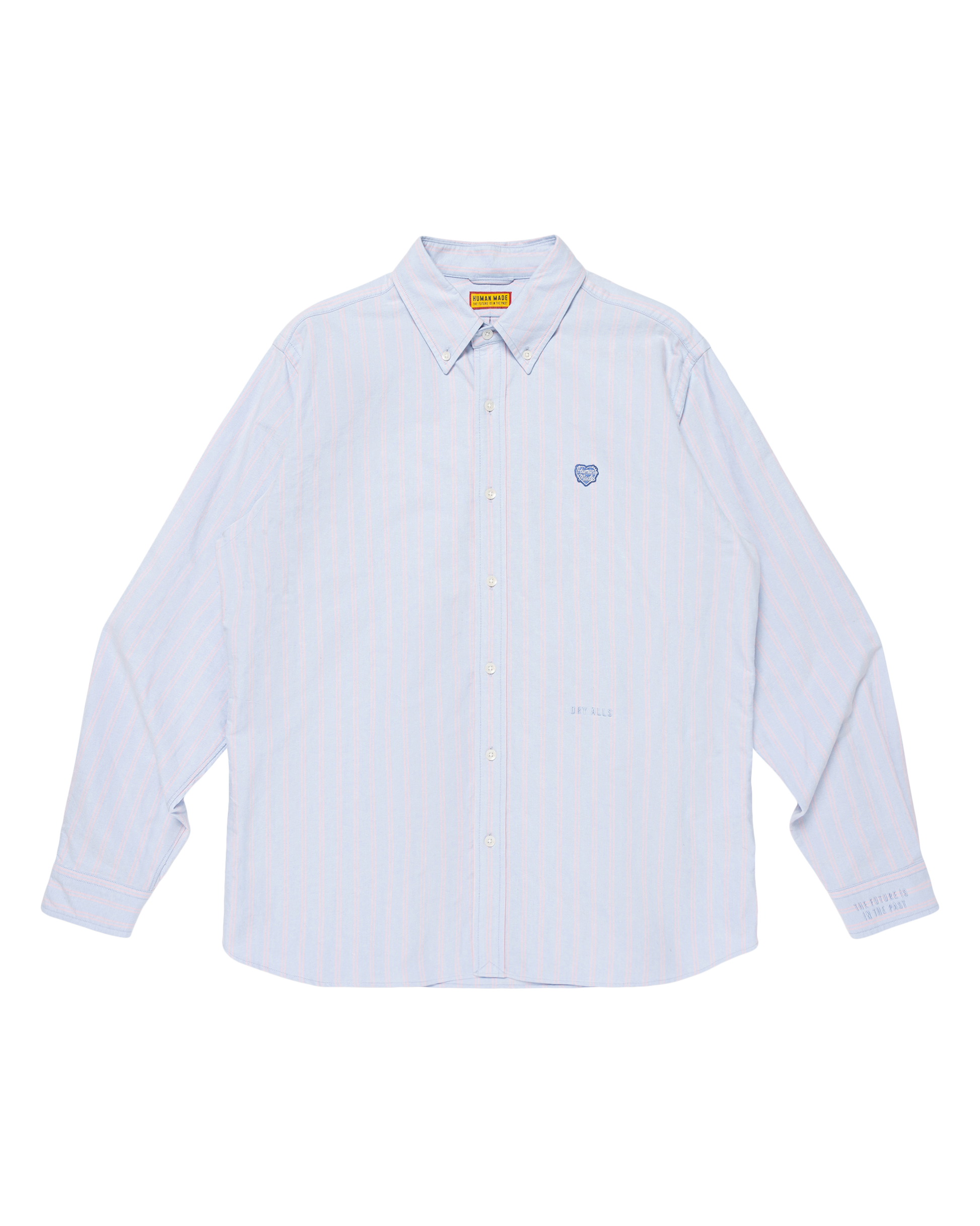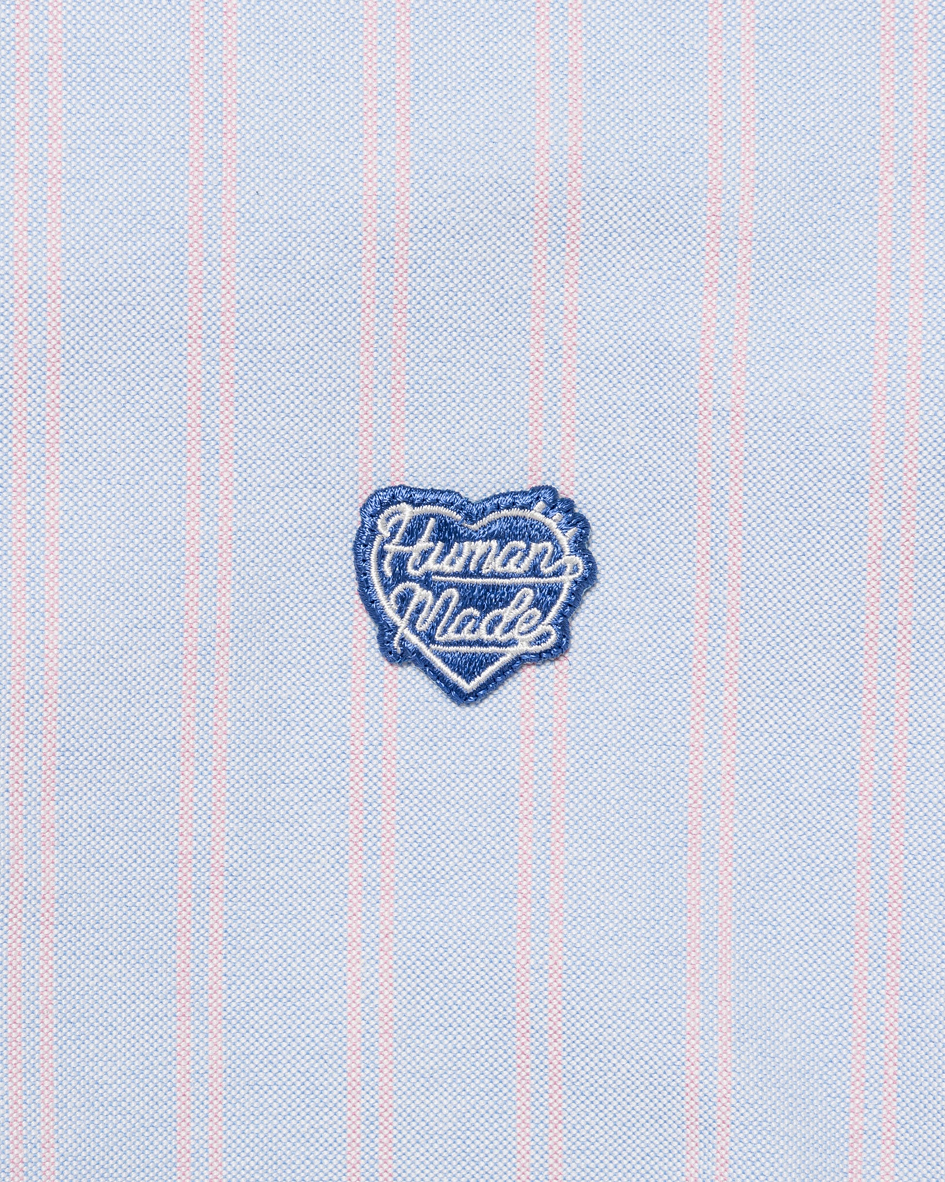 This button-down striped Oxford shirt has a heart patch on the left chest and matching embroidered text on the left front and sleeve.