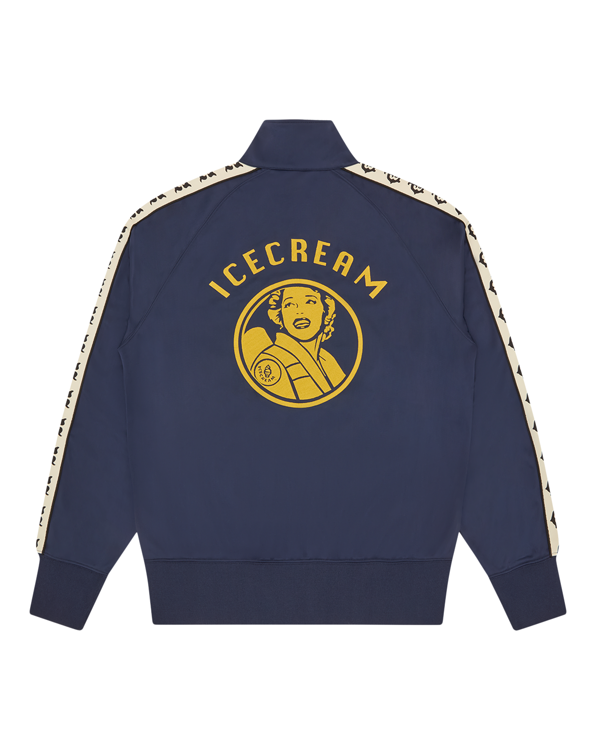 this Team IC Track Top presents the signet IC embroidery on the chest and the ICECREAM branded waitress graphic on the back. It is detailed with a branded full-length woven panelling along the sleeves.