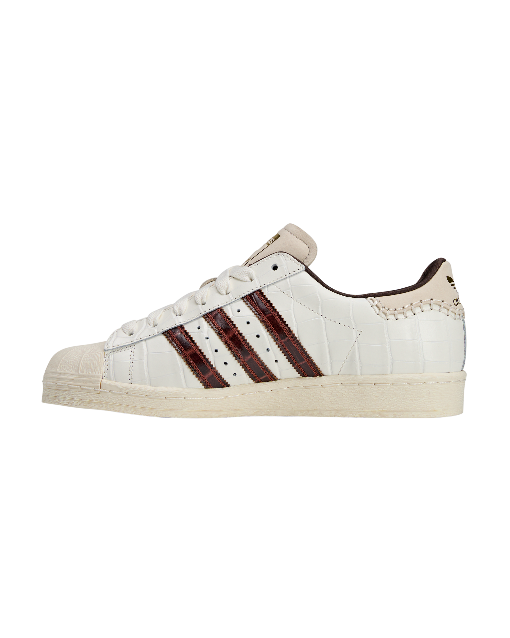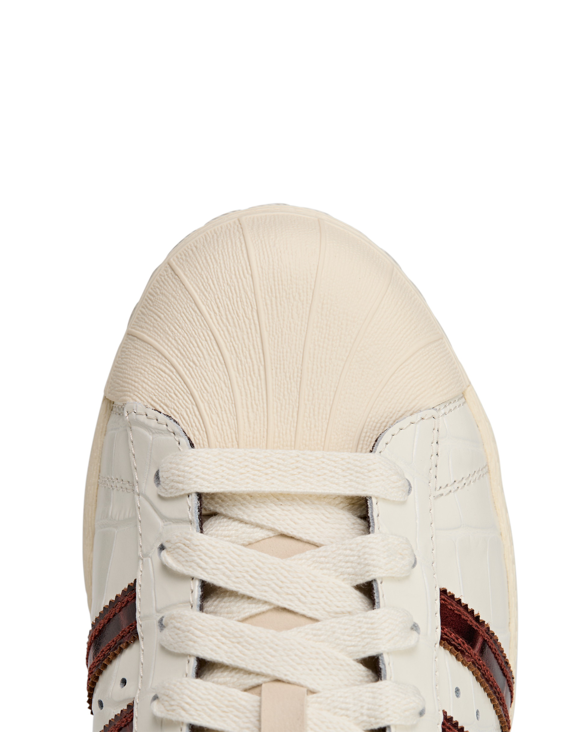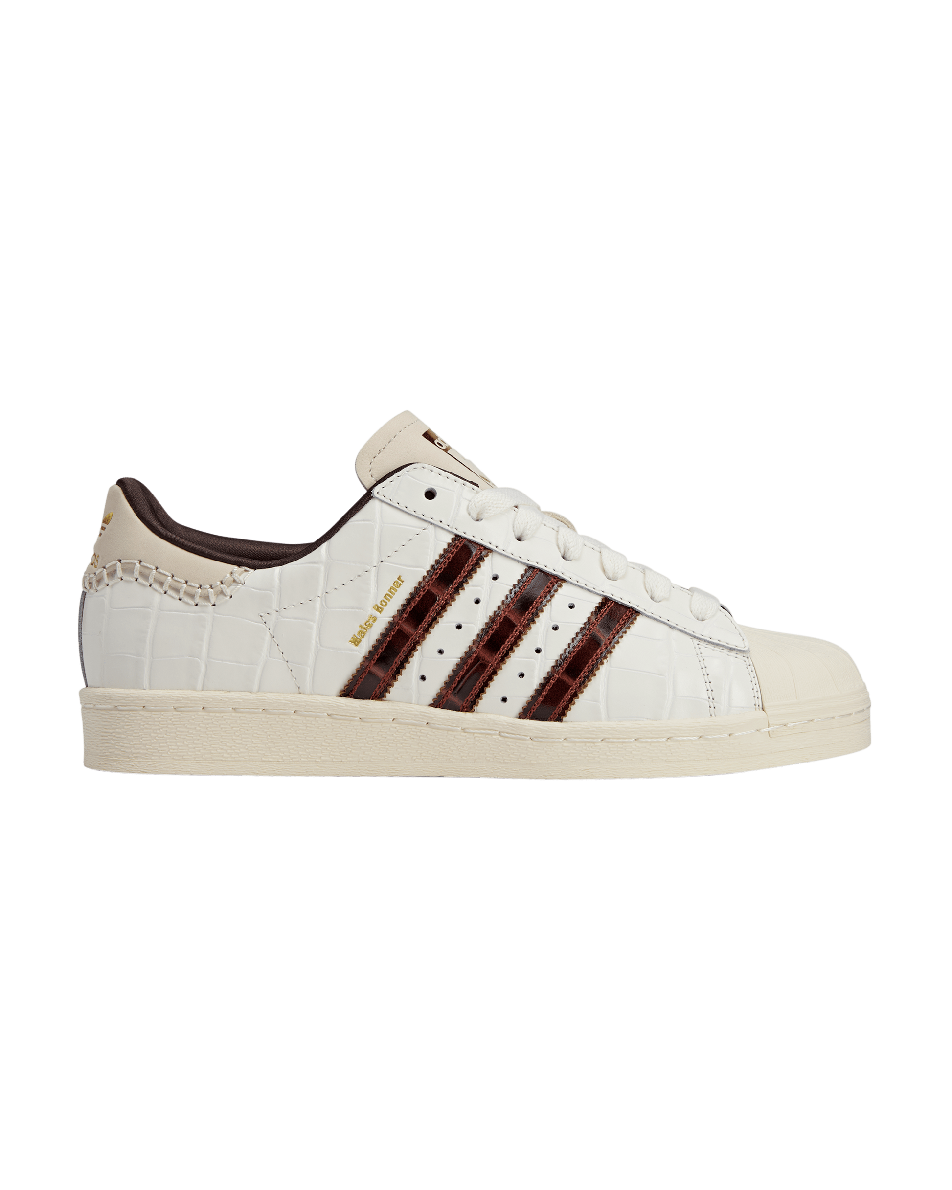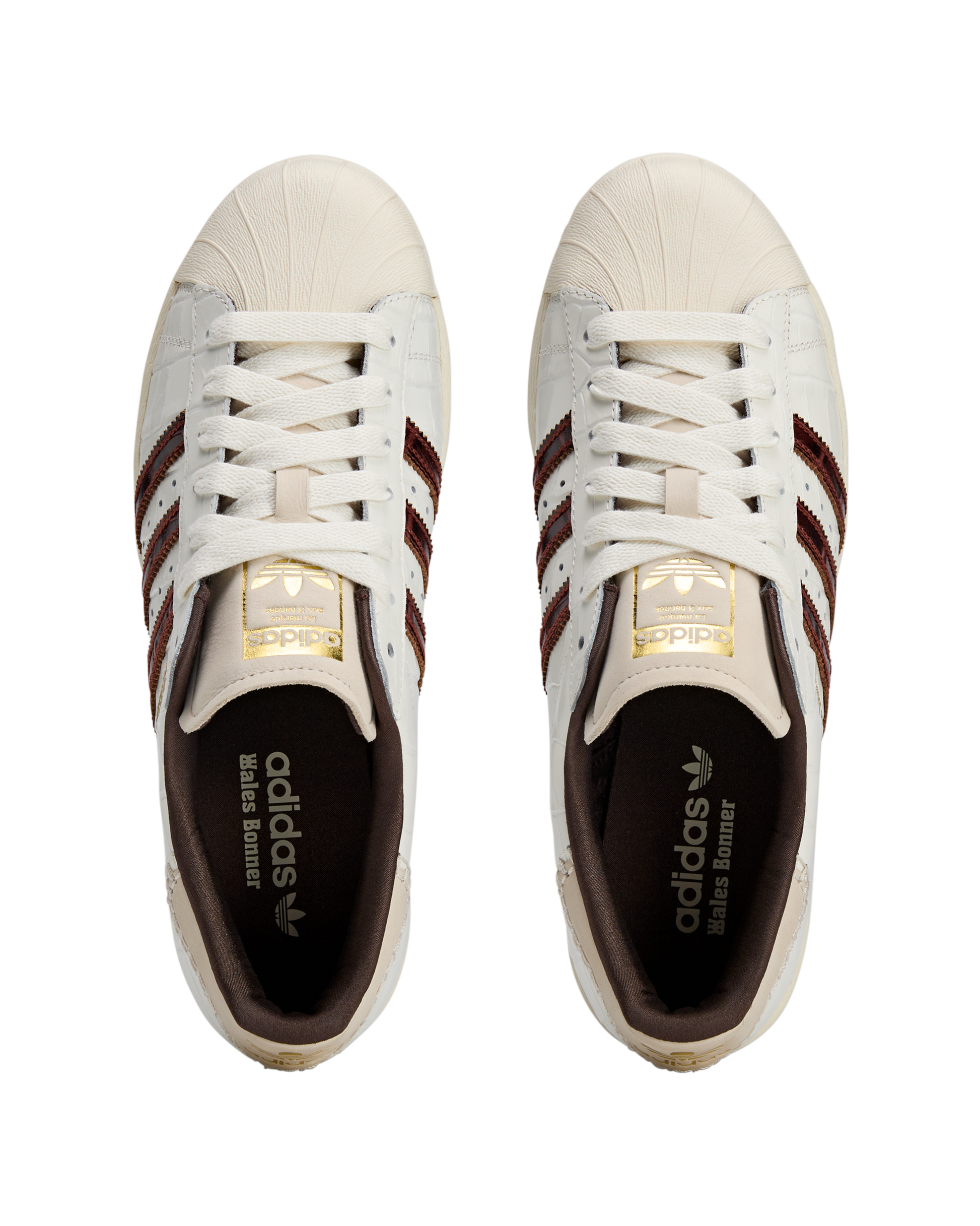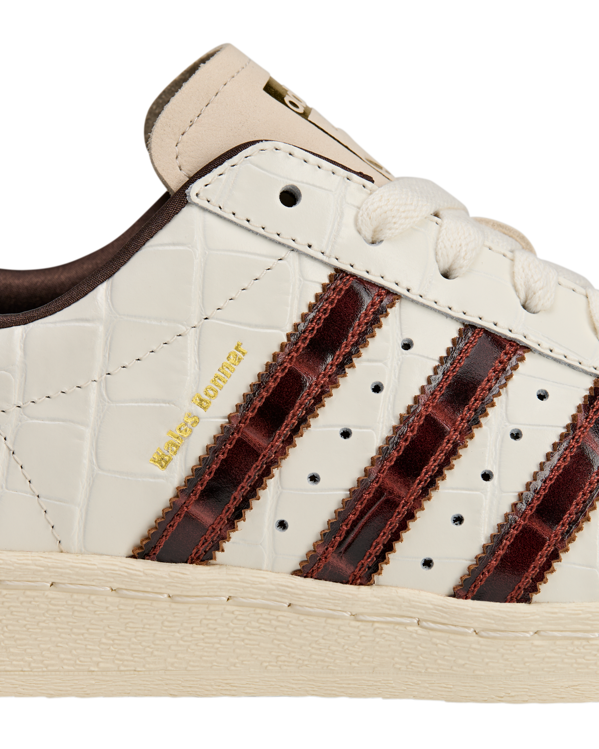 The Wales Bonner Superstar blends classic adidas style with contemporary design. Featuring a croc-textured embossed leather upper and matching 3-Stripes, these shoes stand out with premium nubuck accents on the tongue and heel. Golden metal aglets and foil branding details complete the look.
