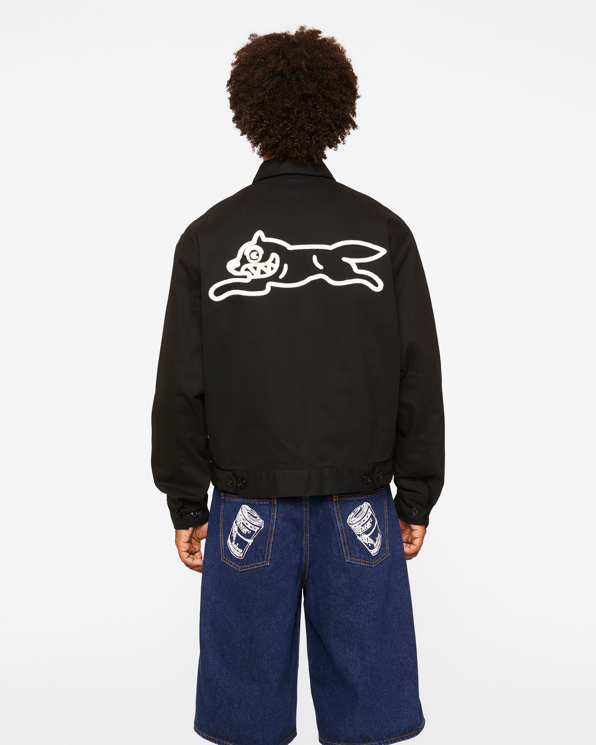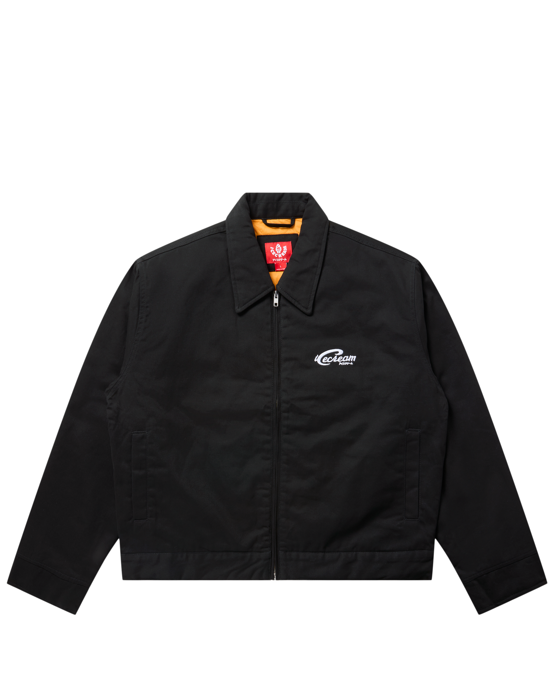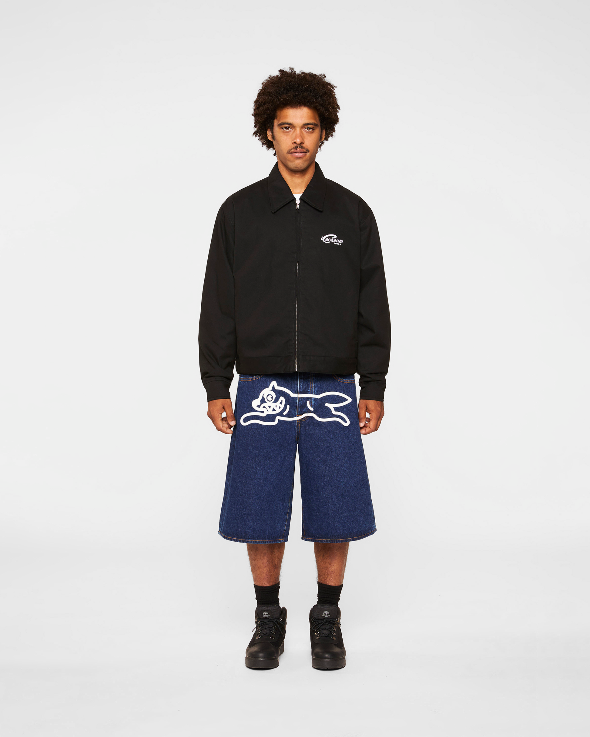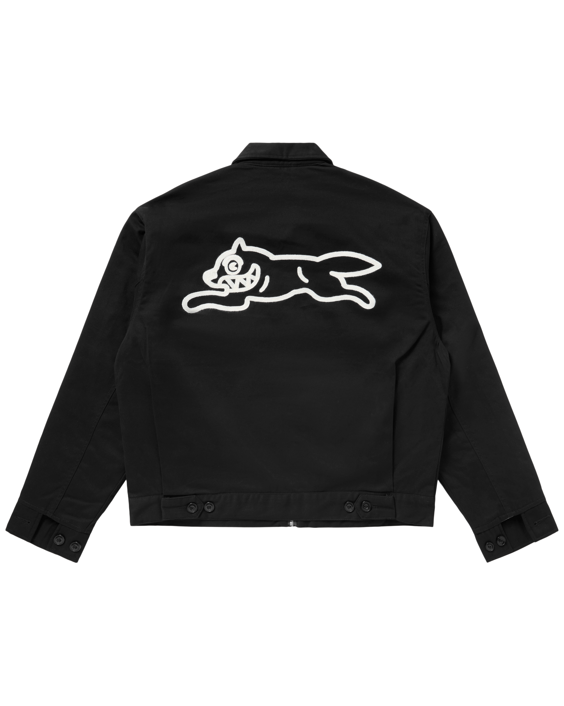 The Work Hard Jacket features the ICECREAM logo printed on the front left chest and the Running Dog graphic printed on the back.